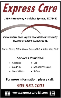 Express Care, located at 1339 South Broadway in Sulphur Springs, is owned and operated by Hopkins County Memorial Hospital. The urgent care clinic will treat everything ranging from the common cold to flu to minor injuries and allergies. The clinic will provide x-ray and an in-house lab to expedite diagnostic services and develop a care plan that will fit your schedule and need.