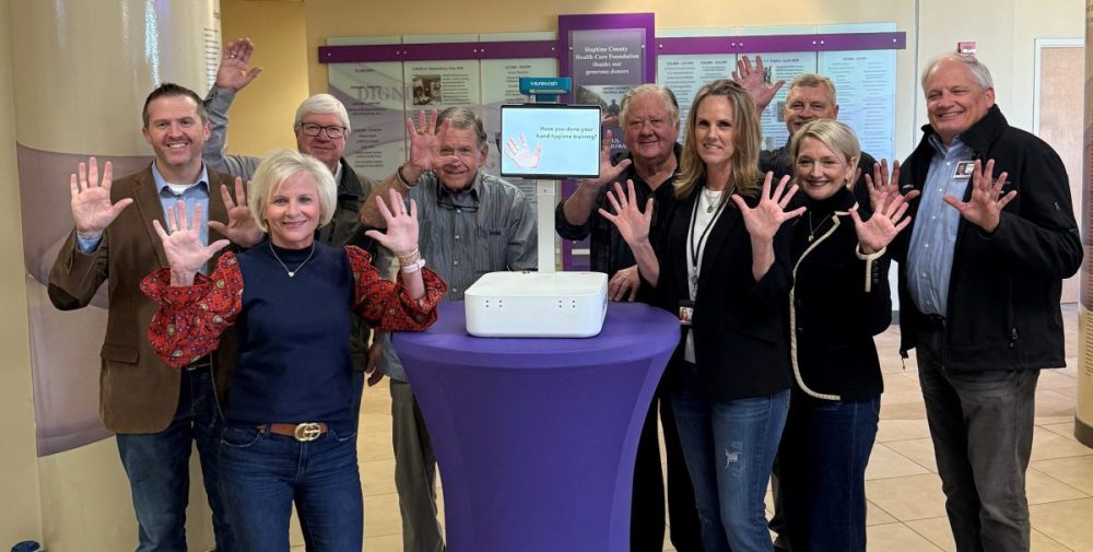 Photo 2: We aren’t afraid of no germs! The Foundation Board of Directors and CMF-SS’ April Gammill show their clean hands as they pose with the portable handwash training station. The 2023 Snowflake Campaign allowed the Hopkins County Health Care Foundation to purchase the training station for the Infection Control Department at CMF-SS. This equipment helps to keep our community healthy by teaching proper handwashing techniques.