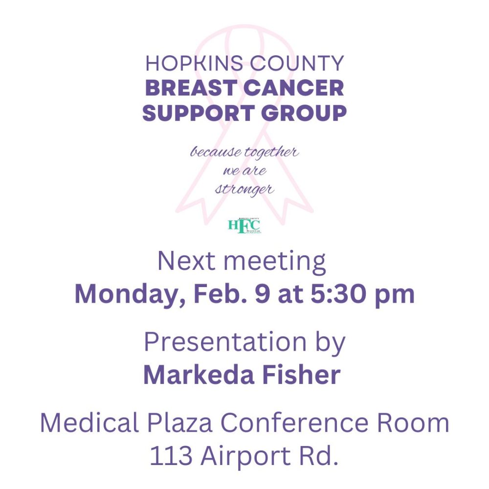 February 4, 2026 – Sulphur Springs, Texas – The Hopkins County Breast Cancer Support Group will meet