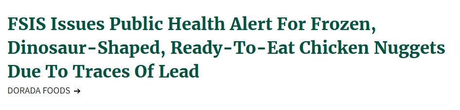 WASHINGTON, April 1, 2026 – The U.S. Department of Agriculture’s Food Safety and Inspection Service (FSIS) is issuing a public health alert for frozen, dinosaur-shaped, ready-to-eat chicken nuggets that may be contaminated with unsafe levels of lead. A recall was not requested because the products are no longer available for purchase. However, FSIS is concerned that some product may still be in consumers’ freezers.