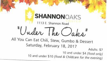 Shannon Oaks will be hosting Under The Oaks, an all you can eat chili, stew, gumbo and dessert event. Adult tickets are $7, children under 10 are $4, and children under 10 with child care for the evening tickets are $10. The Country Store will open, food will begin to be served, along with a silent auction at 4:30. Live music will begin at 5, and a live auction will take place at 6:30. Quart sales will begin a 6:15 at $10 a quart.