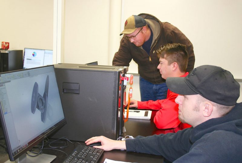 Drafting and computer aided design instructor Brandon Eulberg, left, reviews work by students Tanner Pristien, center, and Alan Hudson. The classes are conducted at the PJC-Sulphur Springs Center. For more information about this and other workforce technology courses, call 903-885-1232.