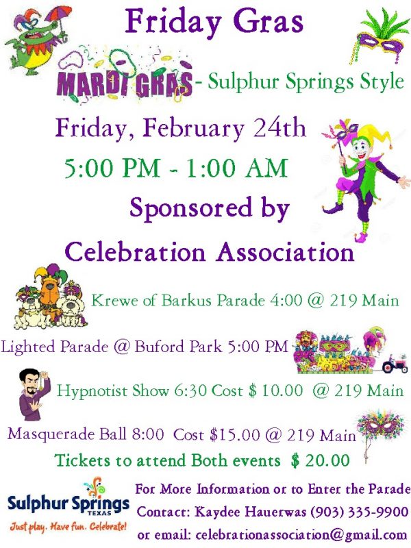 The Celebration Association is sponsoring Mari Gras Sulphur Springs style! The celebration will kick off with a Krewe of Barkus Parade at 4 PM, followed by a lighted parade, a $10 Hypnotist Show, and a $15 Masquerade Ball that will be held at 219 Main St. Festivities will begin February 24th, to enter the parade call Kaydee Hauerwas at 903-335-9900.